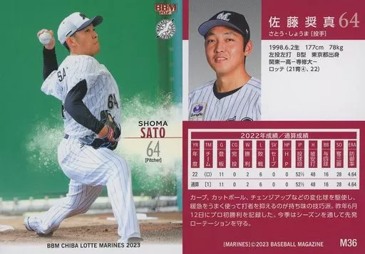Japanese title: BBM/レギュラーカード/BBM 千葉ロッテマリーンズ ベースボールカード2023 M36[レギュラーカード]:佐藤奨真