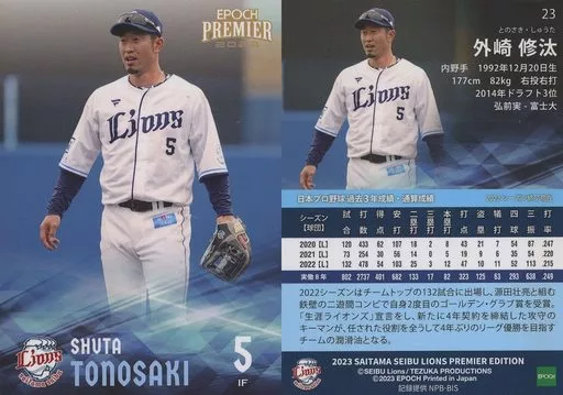 Japanese title: スポーツ/レギュラーカード/EPOCH 2023 埼玉西武ライオンズ PREMIER EDITION ベースボールカード 23[レギュラーカード]:外崎修汰