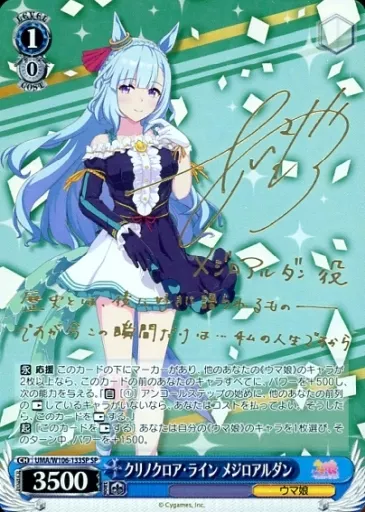 Japanese title: ヴァイスシュヴァルツ/SP/キャラ/ブースターパック ウマ娘 プリティーダービー UMA/W106-133SP[SP]:(ホロ)クリノクロア・ライン メジロアルダン(会沢紗弥金箔押しサイン入り)