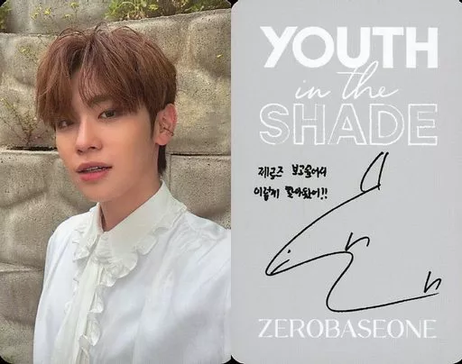 "YOUTH IN THE SHADE" (SHADE Ver.) selfie photo card in ZEROBASEONE / Kim Tae Rae / gray on the back with print sign and message / CDs