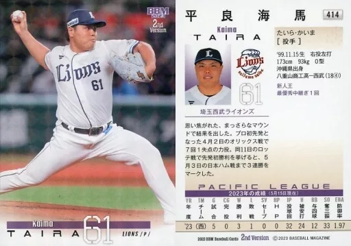 Japanese title: BBM/レギュラーカード/BBM2023 ベースボールカード 2ndバージョン 414[レギュラーカード]:平良海馬(キラカード版)