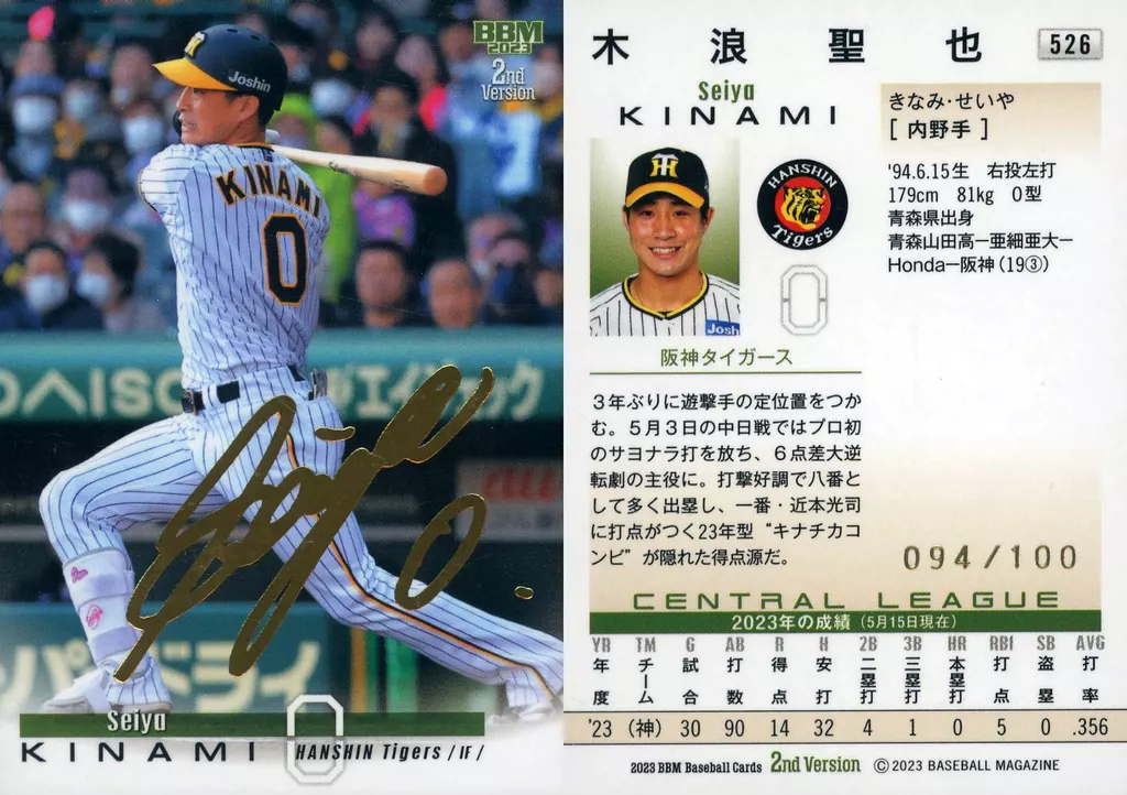 Japanese title: BBM/レギュラーカード/BBM2023 ベースボールカード 2ndバージョン 526[レギュラーカード]:木浪聖也(金箔押しサイン入り)(/100)