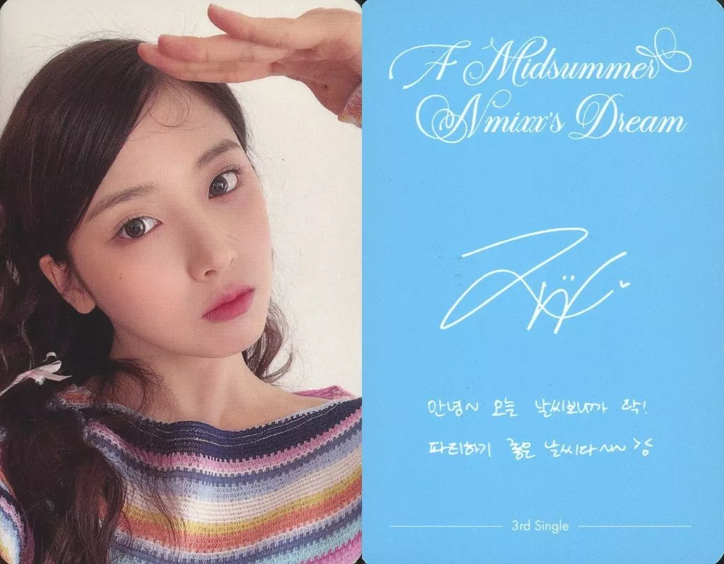 Japanese title: コレクションカード(女性)/CD「A Midsummer NMIXX’s Dream」【通常盤】【Athens Ver.】フォトカード NMIXX/ジウ(JIWOO)/裏面水色・印刷サイン、メッセージ入り/CD「A Midsummer NMIXX’s Dream」【通常盤】【Athens Ver.】フォトカード