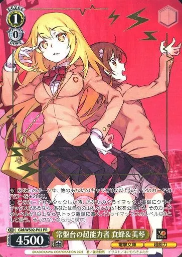 Japanese title: ヴァイスシュヴァルツ/PR/キャラ/WGP2023 タイトルカップ上位賞 Gid/WS02-P02[PR]:常盤台の超能力者 食蜂&美琴(金箔押し)