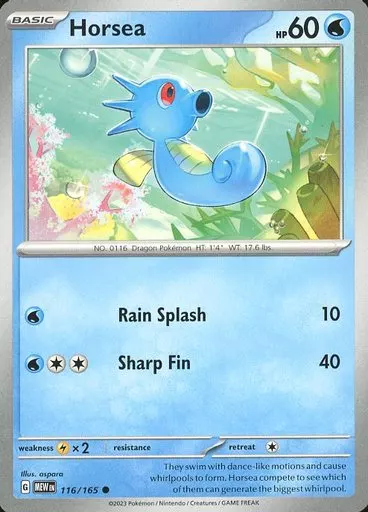 Japanese title: ポケモンカードゲーム/●(C)/水/英語版/Scarlet&Violet-151 116/165[●(C)]:Horsea/タッツー