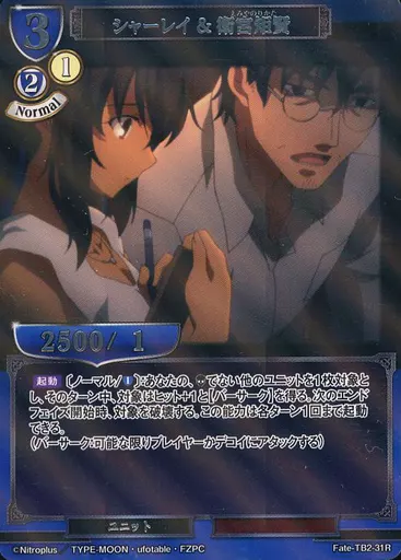 Japanese title: ビルディバイド/R/青/タイアップブースター「Fate/Zero」 Fate-TB2-31R[R]:シャーレイ&衛宮矩賢(パラレル版)