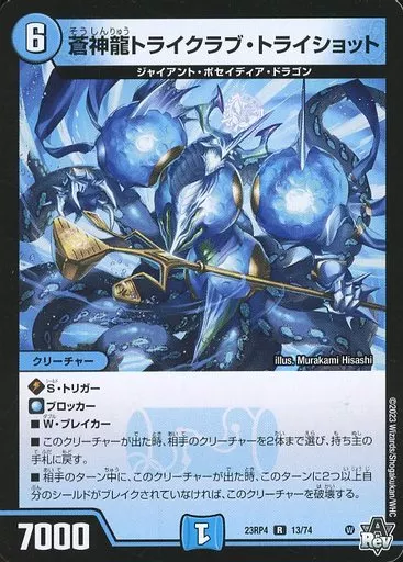 Japanese title: デュエルマスターズ/R/水/[DM23-RP4]アビス・レボリューション 第4弾「竜皇神爆輝」 13/74[R]:蒼神龍トライクラブ・トライショット
