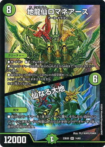 Japanese title: デュエルマスターズ/SR/自然/[DM23-BD5]エキサイティング・デュエパ・デッキ 「不敬なり!真邪眼騎士団」 14/60[SR]:地龍仙ロマネアース/仙なる大地