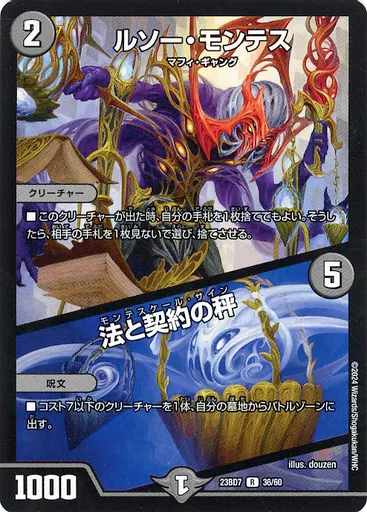 Japanese title: デュエルマスターズ/R/闇/[DM23-BD7]エキサイティング・デュエパ・デッキ 「ネゴシエートの偽衒学者」 36/60[R]:ルソー・モンテス/法と契約の秤