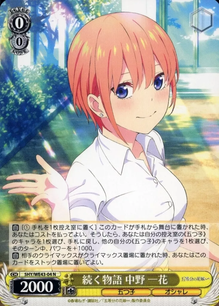 Japanese title: ヴァイスシュヴァルツ/N/キャラ/プレミアムブースター 五等分の花嫁∽ 5HY/WE43-04[N]:続く物語 中野 一花