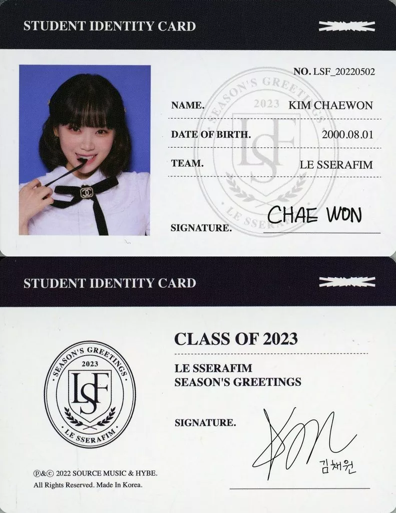 Japanese title: コレクションカード(女性)/「LE SSERAFIM 2023 SEASON’S GREETINGS」学生証カード LE SSERAFIM/KIM CHAEWON(キム・チェウォン)/「LE SSERAFIM 2023 SEASON’S GREETINGS」学生証カード