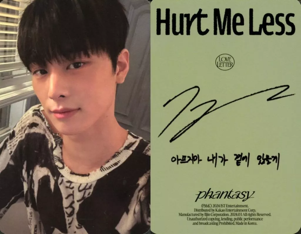 Collection Card (Male) / CD "Phantasy _ Pt. 3 Love Letter" (Write Ver.) Photo Card THE BOYZ/JUYEON / Back Green / Printed with signature ・ "Hurt Me Less" / CDs "Phantasy _ Pt. 3 Love Letter" (Write Ver.) photo card