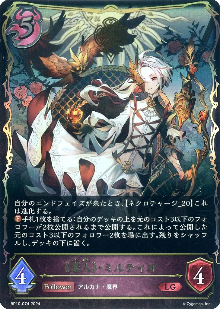Japanese title: シャドウバース エボルヴ/LG/フォロワー/ブースターパック第10弾「Gods of the Arcana」 BP10-074[LG]:<<恋人>>・ミルティオ