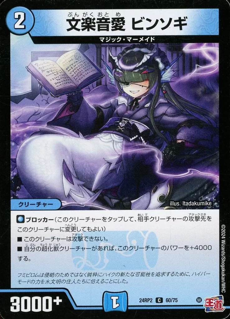 Japanese title: デュエルマスターズ/C/水/[DM24-RP2]王道篇 第2弾 「カイザー・オブ・ハイパードラゴン」 60/75[C]:文楽音愛 ビンソギ