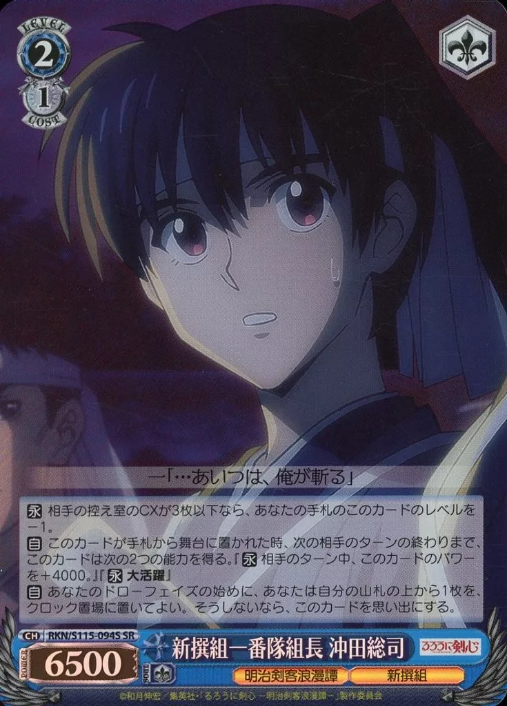 Japanese title: ヴァイスシュヴァルツ/SR/キャラ/ブースターパック るろうに剣心 -明治剣客浪漫譚- RKN/S115-094S[SR]:(ホロ)新撰組一番隊組長 沖田総司
