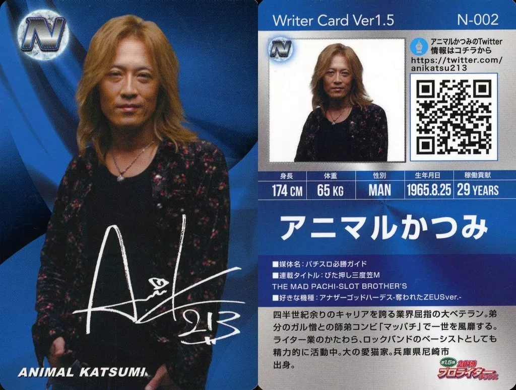 Japanese title: コレクションカード(男性)/プロライターチップス 第1.5弾 N-002[ノーマル]:アニマルかつみ/印刷サイン入り/プロライターチップス 第1.5弾