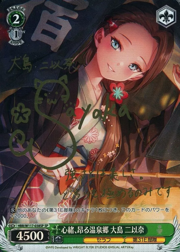 Japanese title: ヴァイスシュヴァルツ/SP/キャラ/ブースターパック ヘブンバーンズレッド Vol.2 HBR/W117-038SP[SP]:(ホロ)心緒、昂る温泉郷 大島 二以奈(金子彩花金箔押しサイン入り)