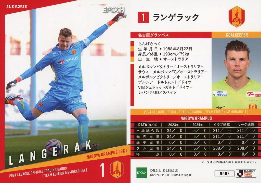 Japanese title: スポーツ/レギュラーカード/2024 Jリーグオフィシャルトレーディングカード [チームエディション・メモラビリア] 名古屋グランパス NG02[レギュラーカード]:ランゲラック