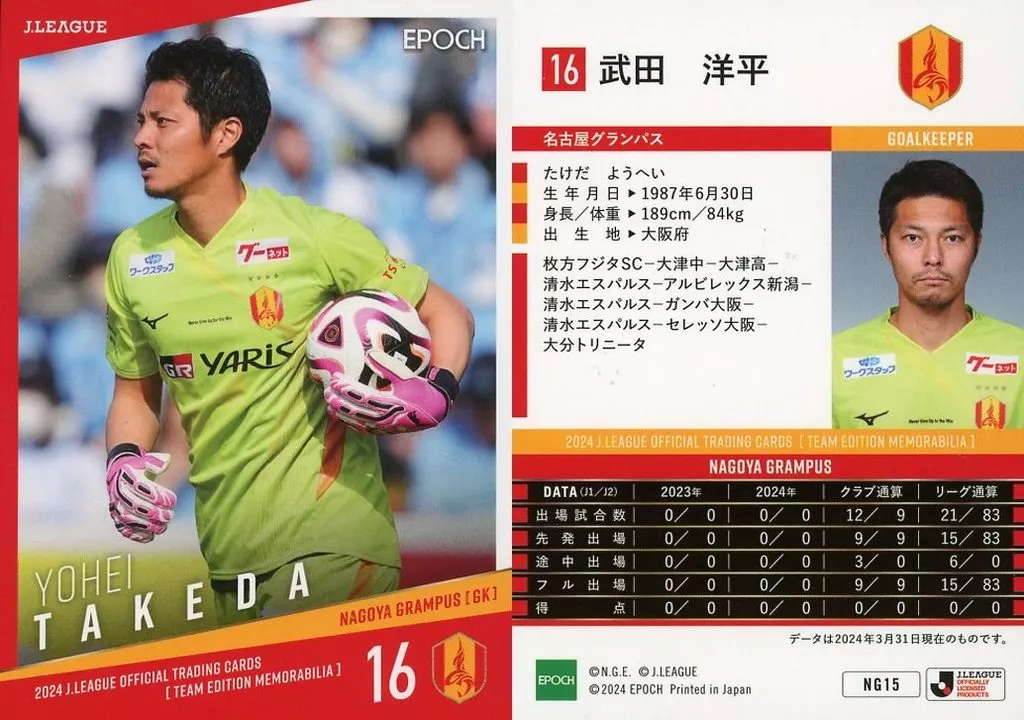 Japanese title: スポーツ/レギュラーカード/2024 Jリーグオフィシャルトレーディングカード [チームエディション・メモラビリア] 名古屋グランパス NG15[レギュラーカード]:武田洋平