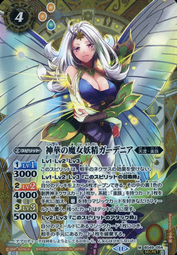 Japanese title: バトルスピリッツ/M/スピリット/テーマブースター AGE OF AVENGERS BS49-054[M]:神華の魔女妖精ガーデニア(SECRET)
