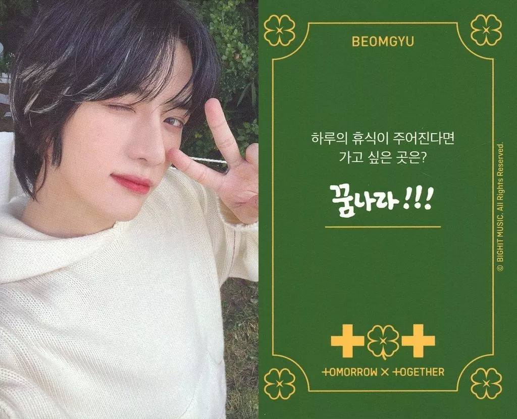 Japanese title: コレクションカード(男性)/「TXT GLOBAL OFFICIAL FANCLUB MOA」3期入会・継続特典Membership Kit封入フォトカード(Log Off) TOMORROW X TOGETHER/ボムギュ/裏面緑・印刷メッセージ入り/「TXT GLOBAL OFFICIAL FANCLUB MOA」3期入会・継続特典Membership Kit封入フォトカード(Log Off)