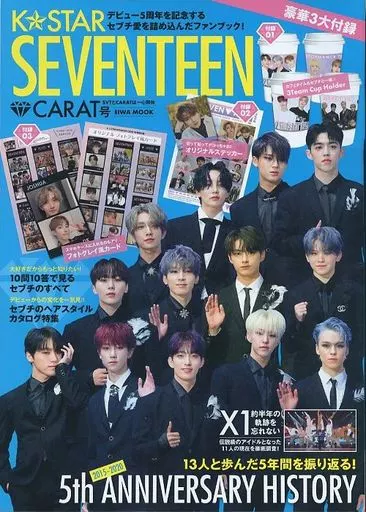 Spelling appendix : 1) original cup holder sheet, 2) original sticker, 3) photo gray style card / Looking back on the 5 years with 13 people! 2015-2020 5th Anniversary History / English-Japanese mook