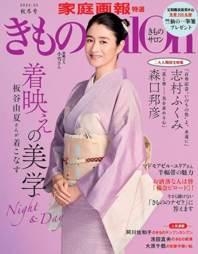 Koyuki no Bijin Kimono / Two Major living national treasure Feature (1) Fukumi Shimura's 100th anniversary "Color of Life" forever (2) Kunihiko Moriguchi's new challenge "Flower and Flower" / Aesthetics of Kimono that Yuka Itaya can wear / Day and night / Sawako Agawa's kimono is Chinpunkampung / Mademoiselle Julia's appeal of half-width obi / Mao Asada's kimono training / Stylish person's ring na velvet / Kimono no naze? / Ms. Ai Maeda's kimono calendar / Ms. Chizuru Ohara's Kyoto kimono lifestyle / Kimono with Salon / What is the reason for today's costume? / Chest box.