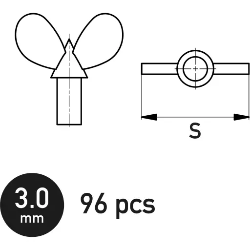 Nombre comercial en japonés: プラモデル 蝶ボルト 3.0mm (96個入り) ディティールアップパーツ [HAUGH-NB20005]