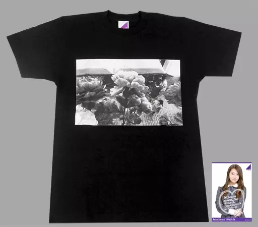 La parte frontal tiene una foto de una flor en blanco y negro, y la parte inferior de la parte posterior está diseñada con las palabras "Reika Sakurai 23 th birthday."