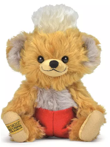 Panky Teddy Bear with scarlet red shorts appeared in gold mohair fabric.