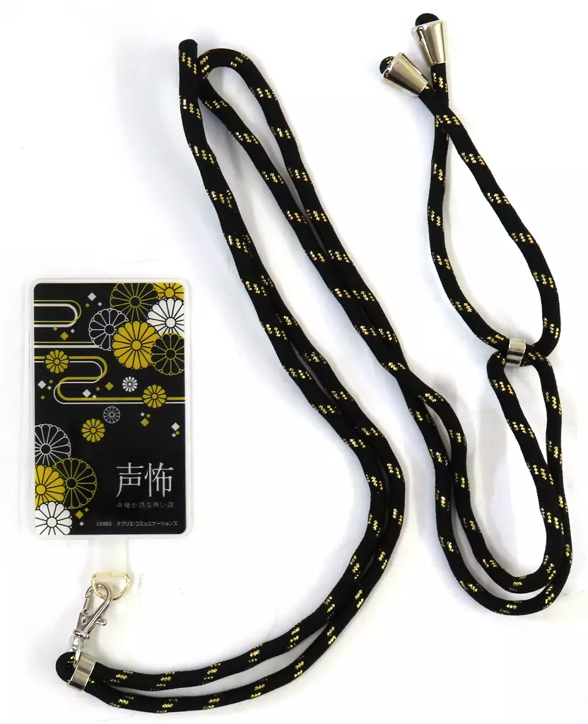 Diseño con el título del evento y flores de crisantemo en la imagen de "Okiku san", una famosa historia de fantasmas relacionada con el lugar del evento en la pestaña de teléfono.