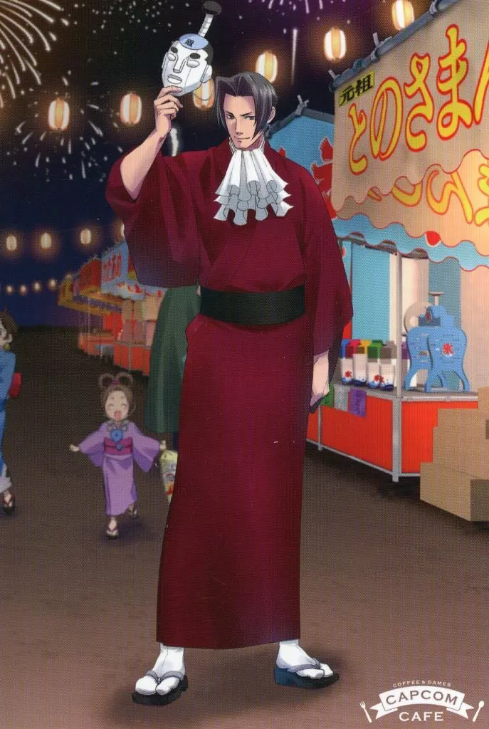 "CAPCOM CAFE× Ace Attorney" com "Esta es una tarjeta postal de estilo 『 bromide 』 con un menú de café especial.