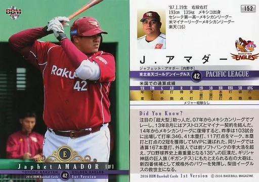 BBM / Regular Card / Tohoku Rakuten Golden Eagles / BBM2016 Baseball Card primo versión 152 [tarjeta regular] : J. Amador