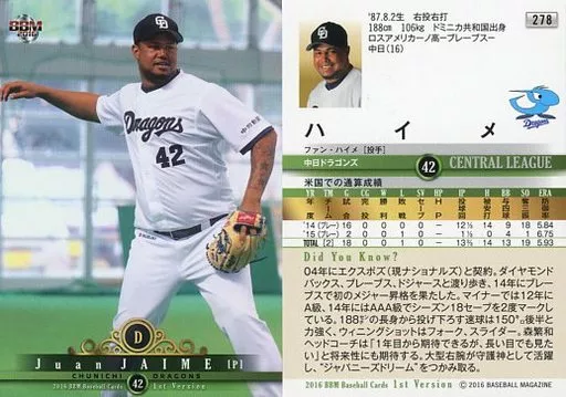 Nombre comercial en japonés: BBM/レギュラーカード/中日ドラゴンズ/BBM2016 ベースボールカード 1stバージョン 278[レギュラーカード]:ハイメ