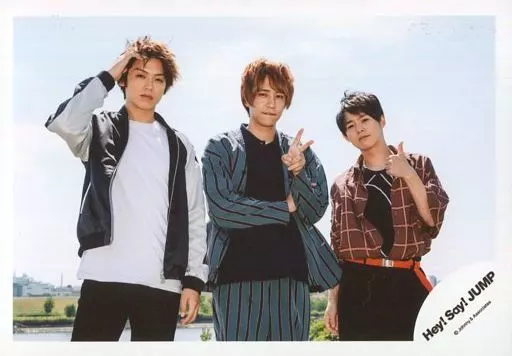 Nombre comercial en japonés: 生写真(ジャニーズ)/アイドル/Hey! Say! JUMP Hey! Say! JUMP/集合(3人)/横型・膝上・衣装・衣装白紺青茶・センター八乙女・高木右手髪の毛触れる・八乙女左手ピース・有岡左手親指立てる・体正面/A.Y.T.「Are You There?」PV&ジャケ写撮影オフショット/公式生写真