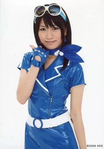 Official photo (AKB48, SKE48) / Idol japonés / AKB48 Hana Tojima / Regazo / Azul de disfraz / Soporte de pulgar derecho / Blanco de fondo / Disfraz de "Jinete" / Oficial / Official photo de intercambio de gacha