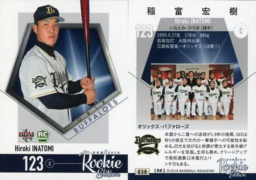 BBM / tarjeta regular / Orix Buffaloes / BBM2018 Rookie Edition 038 [tarjeta regular] : Hiroki Inatomi