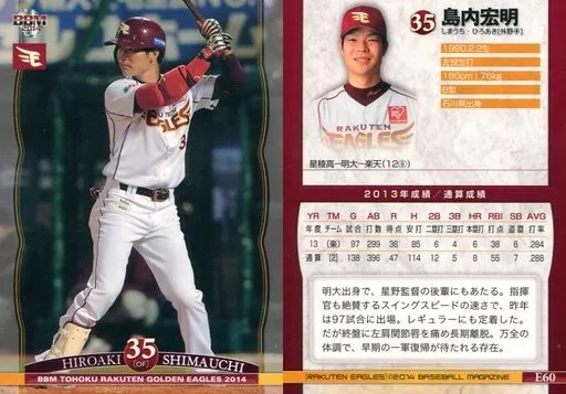 Nombre comercial en japonés: BBM/レギュラーカード/BBM2014 東北楽天ゴールデンイーグルス E60 [レギュラーカード] : 島内宏明