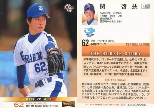 Nombre comercial en japonés: BBM/レギュラー/中日ドラゴンズ/BBM2011 ベースボールカード 1stバージョン 189[レギュラー]:関啓扶