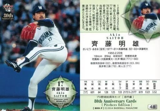 Nombre comercial en japonés: BBM/レギュラーカード/横浜大洋ホエールズ/BBM2014 プロ野球80周年カード・投手編 48 [レギュラーカード] : 齊藤明雄