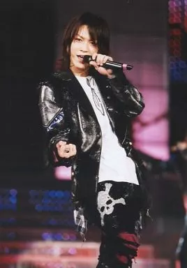 KAT-TUN / Kamenashi Kazuya / disfraz negro, rodilla superior, mano derecha, mano izquierda, micrófono, fondo rosa, foto en vivo / Official photo oficial