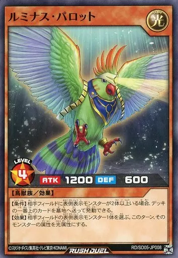 Nombre comercial en japonés: 遊戯王ラッシュデュエル/N/効果モンスター/最強バトルデッキ ズウィージョウ -虚空のヴォイドヴェルグ- RD/SD05-JP008[N]:ルミナス・パロット