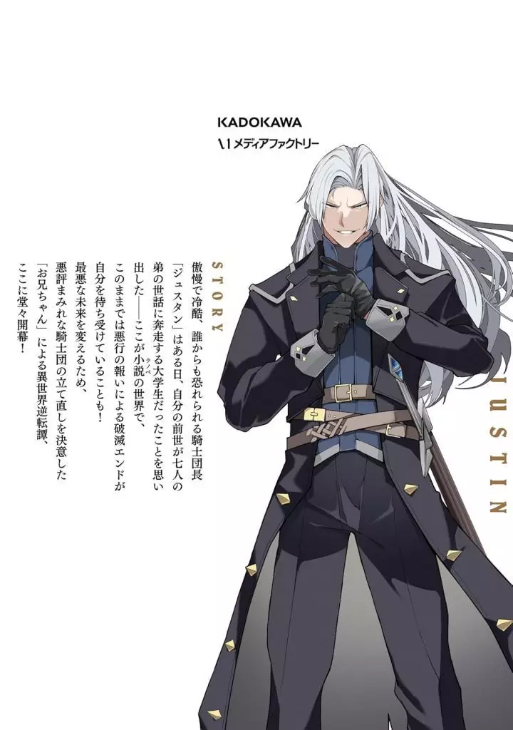 傲慢で冷酷、誰からも恐れられる騎士団長「ジュスタン」。ある日、彼は前世で七人の弟達の世話に奔走する大学生だったことを思い出す。その記憶によれば、ここはライトノベルの中の世界。そして、この先に待っている展開は 悪行の報いによる破滅エンド!?未来を変えるため、ジュスタンは自らの行いを正し、前世で培った「お兄ちゃん力」で団員たちを躾け直そうと一念発起したが、悪役騎士団長が始めた“善行”の数々は、団内どころか国中を揺り動かしていき……!?新たなる異世界コミック、ここに堂々開幕!