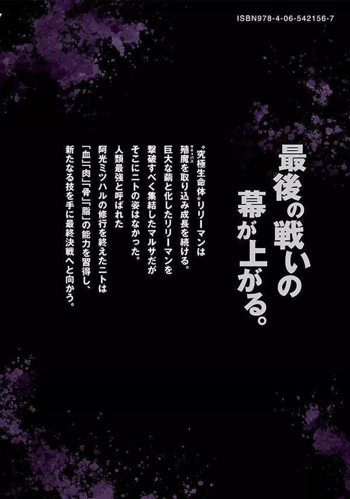 殖魔vs.人類、最終決戦!! 無限に広がる繭から世界を守れ!!「究極生命体」リリーマンは、殖魔を取り込み成長を続ける。巨大な繭と化したリリーマンを撃破すべく集結したマルサだが、そこにニトの姿はなかった。人類最強と呼ばれた阿光ミツハルの修行を終えたニトは「血」「肉」「骨」「脂」の能力を習得し、新たなる新技を手に最終戦へと向かう。骨の派閥首領&脂の派閥首領の猛攻。隊長が集結する総力戦!!ハリウッドでCGアーティストとして活躍していた異色の経歴を持つ作者が贈る、日本を揺るがす超ド級エンタメ作品第12巻!!!!