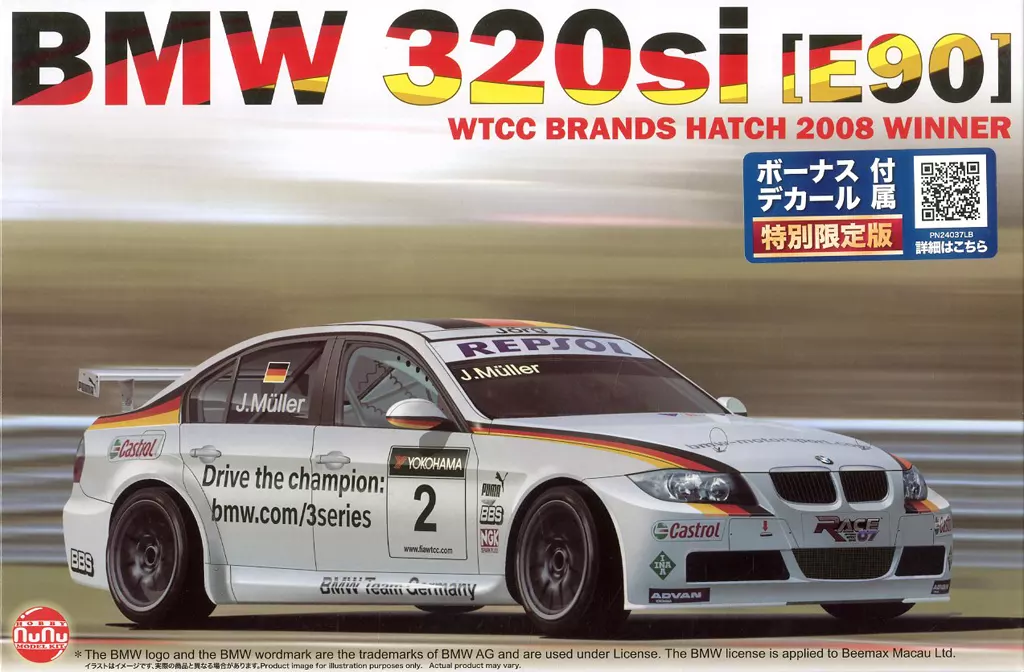2008年の世界ツーリングカー選手権で活躍したBMW320si E90を再現したキットです。2008年のWTCC、ブランズハッチでのレースで優勝したマシンを1/24スケールでモデル化しています。