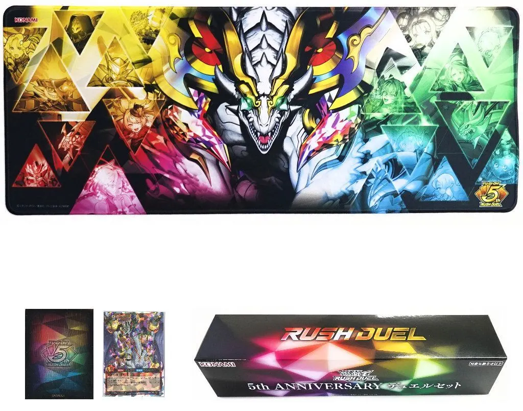 商品解説■こちらの商品はコナミスタイル限定商品になります。遊戯王ラッシュデュエル5周年を記念したデュエルセットをコナミスタイル限定で登場!【商品詳細】<セット内容>特製デュエルフィールド(プレイマット):1枚特製デュエリストカードプロテクター(スリーブ):100枚特典カード「永劫の神導龍」(オーバーラッシュレア仕様):1枚