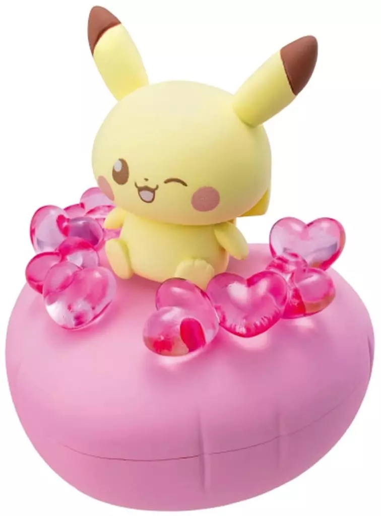 ハートのクッションにピカチュウとクリアのハートがちょこんとのったてのひらサイズのドールだよ!