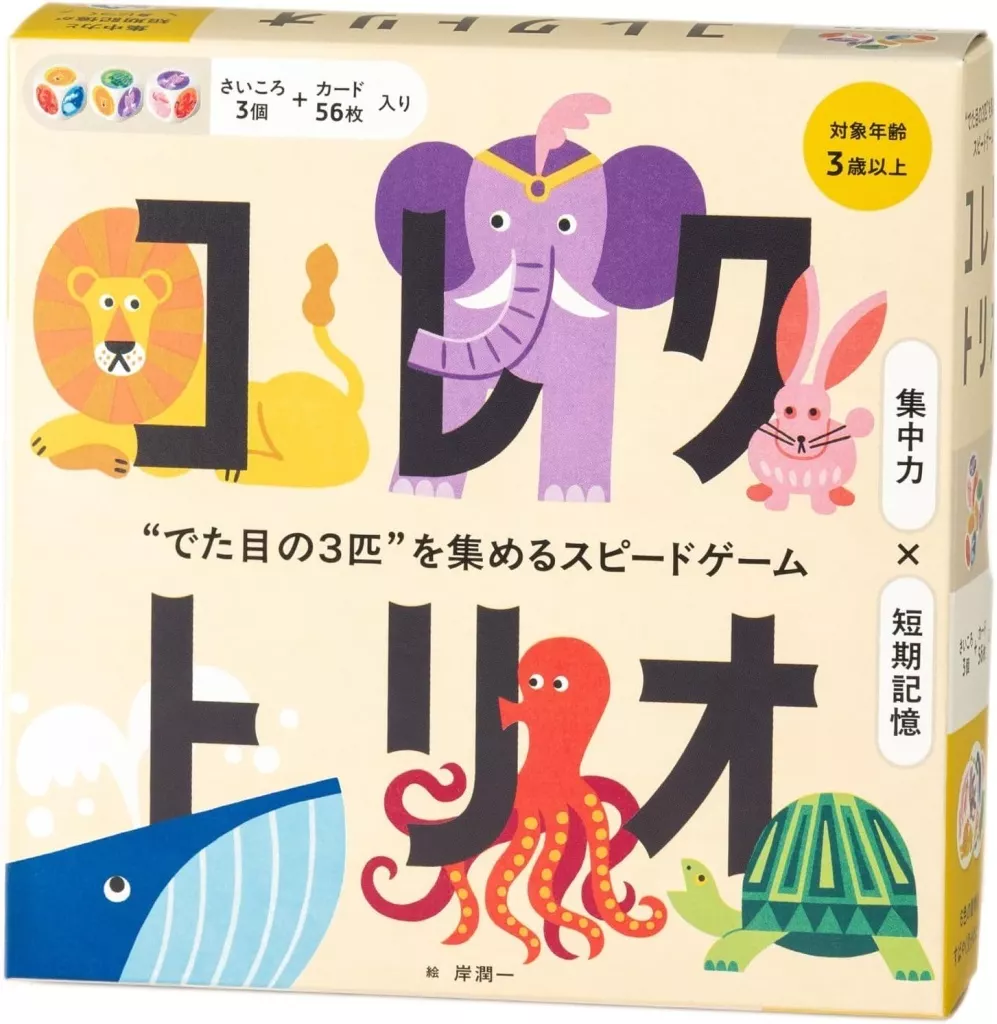 商品解説■コレクトリオ “でた目の3匹”を集めるスピードゲームが登場!!家族・お友だちみんなで楽しく遊べる!絵本から飛び出したような動物たちの6種から3匹の組み合わせを見つけよう!!■ゲーム概略■プレイ人数:2人以上プレイ時間:約15分対象年齢:3歳以上<内容物>カード 56枚さいころ 3個シール台紙 1枚取扱説明書 1部素材:カード・シール台紙・ガイド/紙、さいころ/アクリル