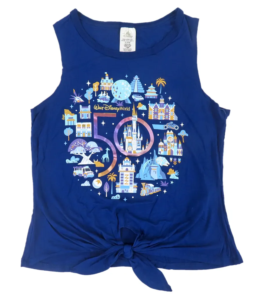 お城を中心に、テーマパークを象徴するさまざまなモチーフを配置。虹色にきらめくアニバーサリーナンバー『50』のロゴが目を引きます。裾を一結びしたようなデザインでオシャレな着こなしが叶いそう。