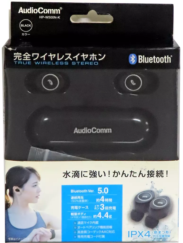 ○水滴に強い、かんたん接続の、完全ワイヤレスイヤホン○Bluetooth Ver.5.0対応○防水保護等級IPX4(防まつ形)○連続再生約4時間(50%音量時)○付属の充電ケースでイヤホンを約3回充電可能○軽量ボディ(イヤホン1個あたり)約4.4g○通話マイク内蔵○オートペアリング機能搭載○高音質コーデックAAC対応電源DC5V(USB給電…microUSB端子)内蔵バッテリー充電式リチウムポリマー電池(イヤホン…50mAh、充電ケース…350mAh)通信方式Bluetooth標準規格Ver.5.0対応プロファイルHSP、HFP、A2DP、AVRCP、TWS、SPP対応コーデックSBC、AAC変調方式/周波数帯域FHSS/2.402~2.480GHz最大通信距離見通し約10m(Class2)再生周波数帯域20Hz~20kHz(A2DP)マイク指向特性/感度無指向性/-45dB充電時間イヤホン…約1時間30分、充電ケース…約1時間(ともに残量ゼロからフル充電まで)音楽再生可能時間最大約4時間(50%音量)通話可能時間最大約4.5時間(50%音量)待受可能時間最大約100時間許容動作温度/湿度温度…0~40℃、湿度…20~80%(結露なしにて)防水性能IPX4=防まつ形(イヤホンのみ)外形寸法イヤホン…幅27.4×高さ22.6×奥行17mm、充電ケース…幅92.5×高さ29.6×奥行35.9mm質量イヤホン…約4.4g(1個あたり)、充電ケース…約38.3g(ケースのみ)付属品充電ケース、専用充電コード、イヤーチップ(S・M・L※Mは本体に装着済み)、保証書、取扱説明書